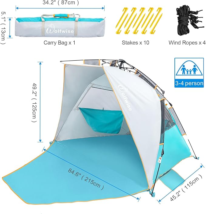 WolfWise 3-4 Person Easy Up Beach Tent UPF 50+ Portable Instant Sun Shelter Canopy Umbrella with Extended Zippered Porch, Blue