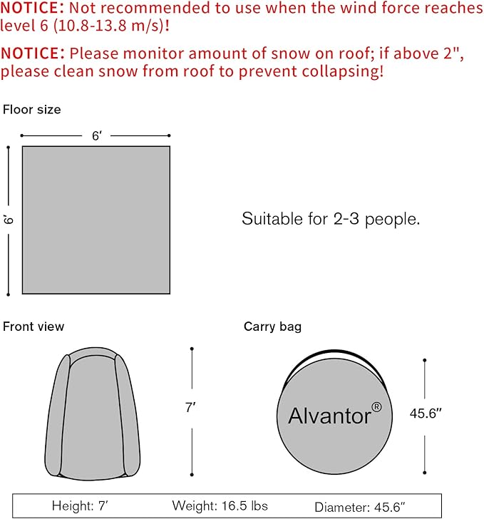 • PATENT PENDING PROTECTED ALVANTOR DESIGN: This winter screen house measures at (Width: 6’, Depth: 6’, Height: 7’) and comes with a compact carry bag. Weighing just 16.5 lbs, this pop up igloo tent has an innovative folding technique making it easy to fold down and store back in the carry bag. Ready to go in minutes!