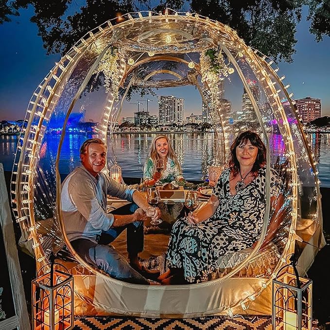 • SPACIOUS AND WARM: Alvantor big bubble gazebo provides a spacious interior shelter that comfortably fits between two and three adults. Enough room to place various pieces of furniture so you can give your bubble tent a homely feeling. The four, transparent PVC windows provide 360° view of your surroundings, whilst the inside of your bubble tent stays warm thanks to the excellent heat retention.