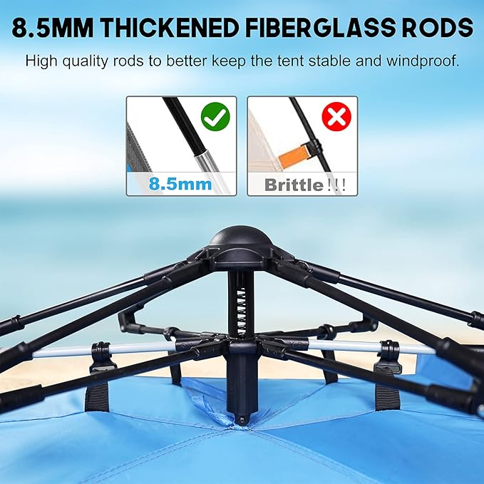 • Durable and Windproof:MIRUS beach tent is made of 8.5mm fiberglass frame, high quality poles make the beach tent more durable; And equipped with 3 sand bags, 8 steel stakes, 6 sand stakes and ropes, the combination of inserts and stakes makes the beach tent grip more firmly and resist strong winds more effectively.