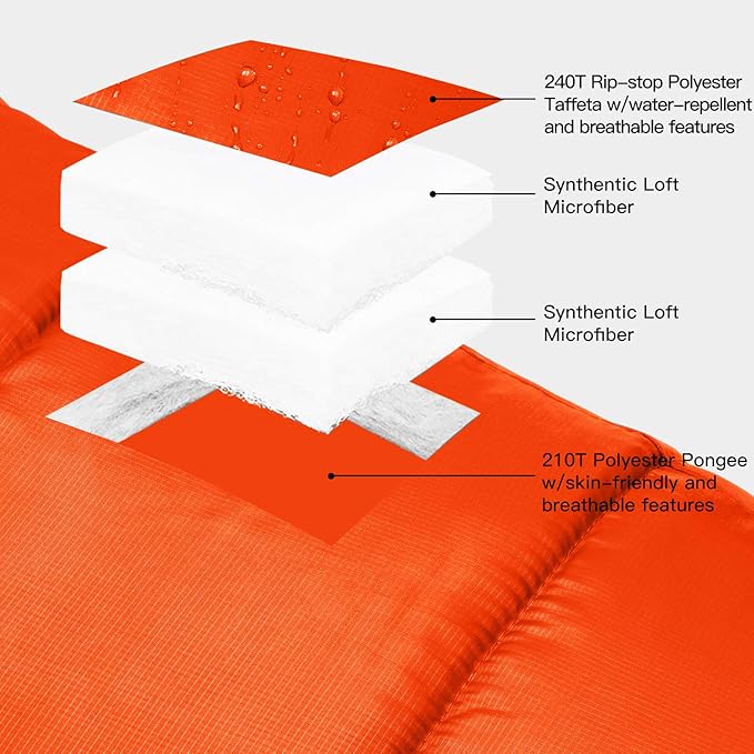 • Water Resistant & Comfortable: Lining adopt 240T Rip-stop Polyester Taffeta water repellent and breathable features, It effectively increases the toughness of the sleeping bag. and with double layer synthetic loft microfiber, Provides greater comfort for your body