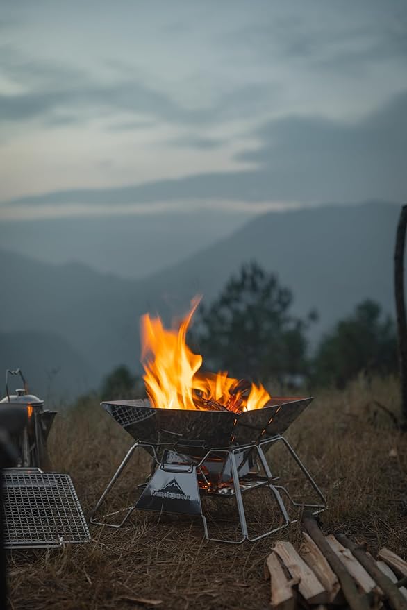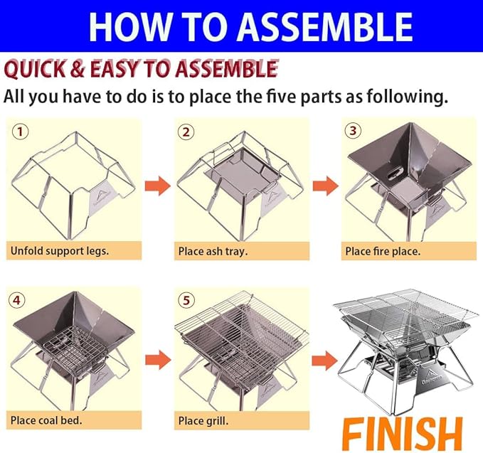 • This foldable camping grill portable campfire grill also has an ash catcher plate below the grill, which makes this camping charcoal grill very easy to clean.