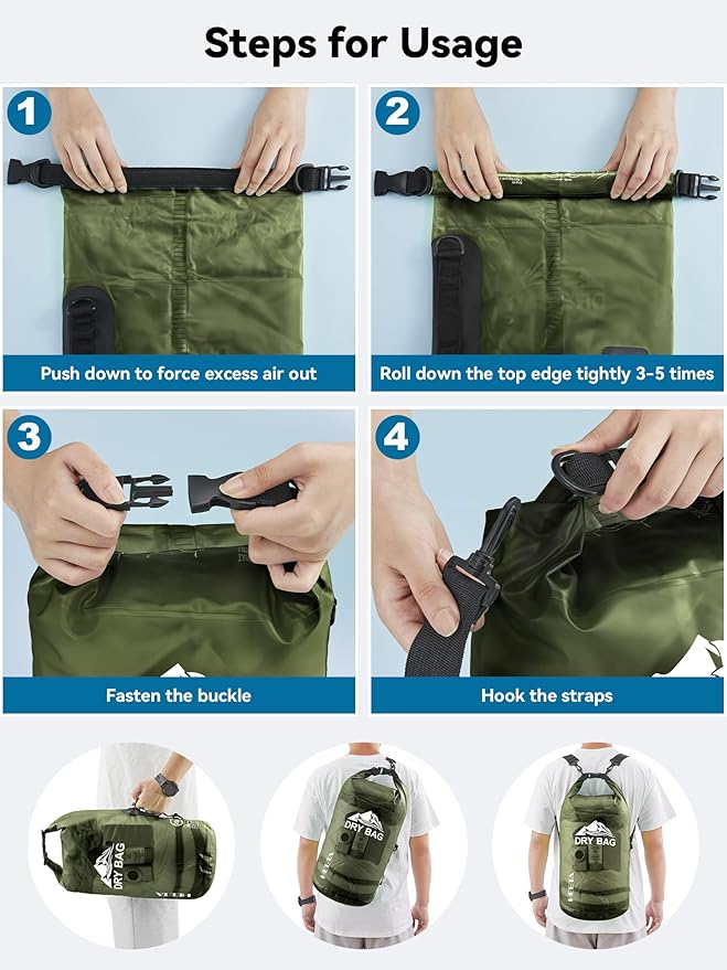 • 5 Sizes (5L/ 10L/ 20L/ 30L/ 40L) to choose - Great beach vacation and cruise ship essentials, a right choice for the gift to women and men, each bag comes with a free waterproof cell phone case, bring comprehensive waterproof protection to your water sports. You can control the size of the dry bag by the number of times you roll the top edge