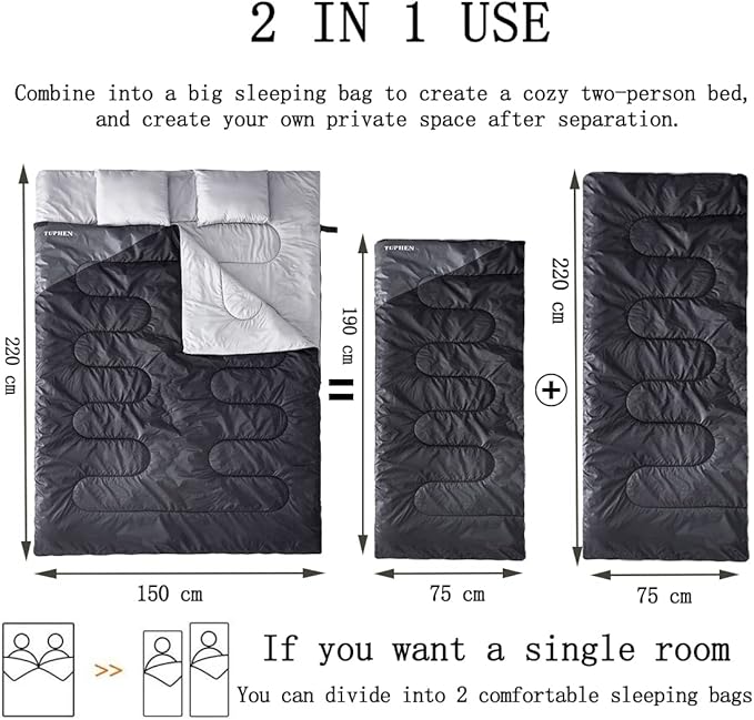 Tuphen Double Sleeping Bag, Sleeping Bag with 2 Pillows, Queen Size XL Bag for 2 People, Cold Warm Weather- 3 Seasons, Waterproof Adults for Camping, Backpacking or Hiking