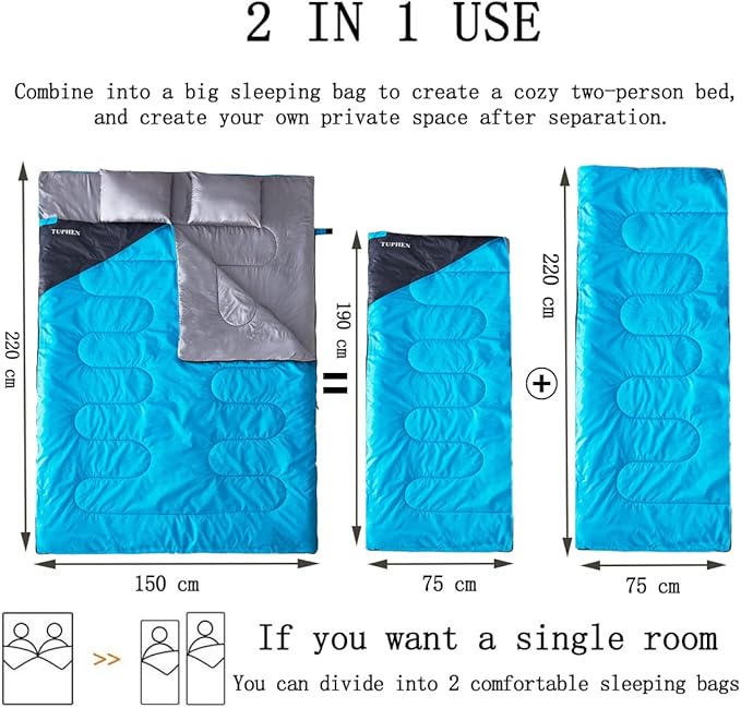 • Dual Usage: The double sleeping bag , which fits two happy campers comfortably, and can be disassembled by a zipper to become two independent sleeping bags.Imagine the memories you will leave with it.