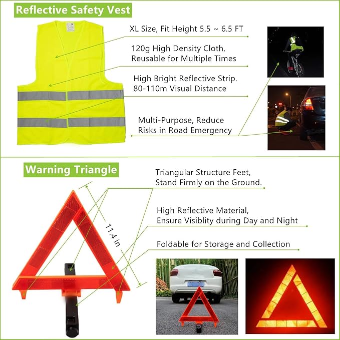 • 【PREMIUM QUALITY】 8Gauge x 10ft Jumper Cables, 10,000 Lbs x 12ft Tow Straps, 12V Tire Inflator, 39 x 39in Fire Blanket, 11in Warning Triangle, etc. The appearance and performance of every single accessory will be inspected before shipment to ensure each set of emergency roadside kit for car can be delivered to you perfectly.