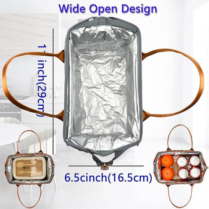 • ✿ Wide-Open Design & Large Size: Our women bag can be opened up to 11"L x 6.5"W by dual zipper closure, you can put into or take out of your lunch or other kinds of stuff horizontally, avoid spilling soup or liquid in the bag. The dimension is:11” L×6.5” W×11” H,it could give roomy storage space you need to hold your favorite meals, delis, and lunch treat. You could fill the compartments or pockets with lunch boxes, food containers, condiments, fruit salad bowls and other essentials.