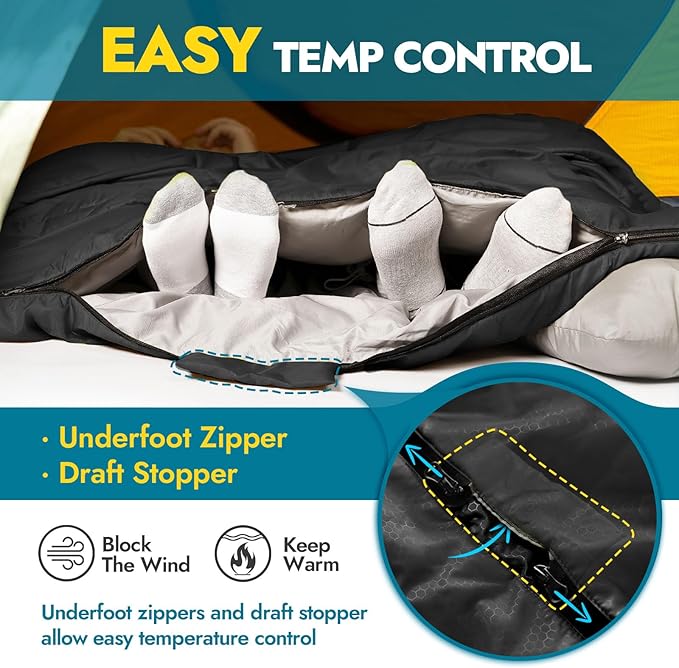 • 4 IN 1 DESIGN: Our two person sleeping bag can be separated into two individual sleeping bags if you need. Because both sides of the sleeping bag have the double-sided zipper. So it can be divided into two parts with a zipper on one side. You can also use it as a blanket when you're at home or take a nap at office when it's full opend