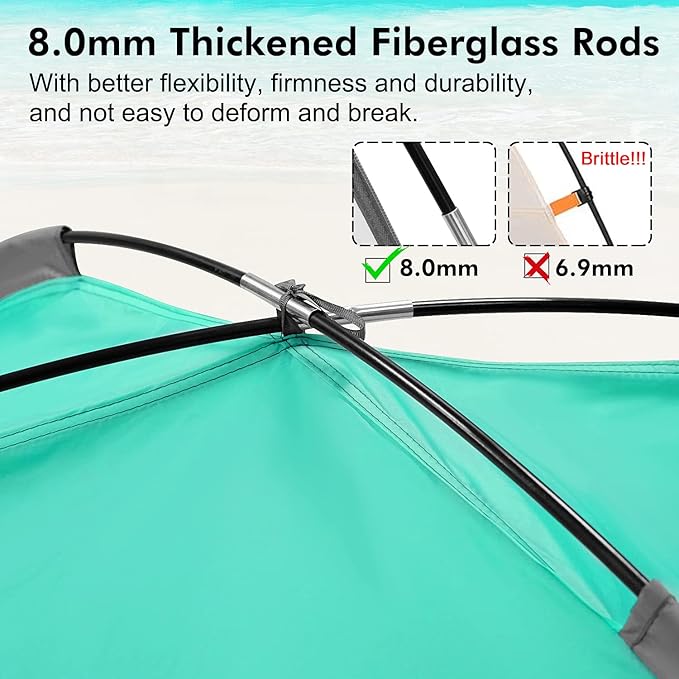 • 8.0mm Thickened Fiberglass Rods: We increased the thickness of the fiberglass rods to 8.0mm to make it more flexible, sturdy and durable. It can support the tent more stable and will keep shape even after long time use.