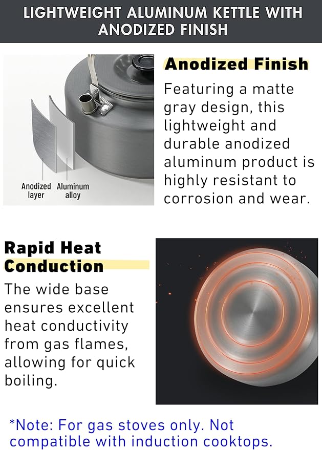 • This 1.5 Liter hard-anodized aluminum camping tea kettle is only 7.8oz weight, which is lightweight and compact for camping, backpacking.