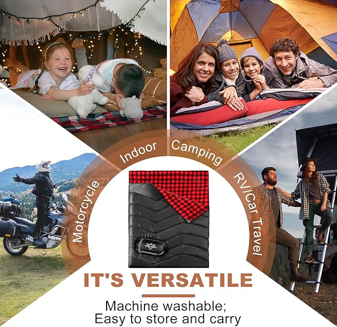 • LARGE DOUBLE SLEEPING BAGS FOR ADULTS AND KIDS! FAMILY CAMPING FAVORITE! This Queen Size Sleeping Bag with a width of 63” is large enough for two people providing a roomy experience for couples and even families with small children. Or as 2 individual sleeping bags, or two queen sized blankets. Perfect for hiking, camping, traveling, Essential for Car Camping!