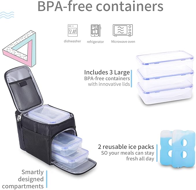 • Included goods: the thermal insulation bag includes 3 large food boxes and 2 cold insulation bags to keep the food fresh and cool. The container does not contain BPA and can be used for refrigeration, microwave oven and dishwasher.