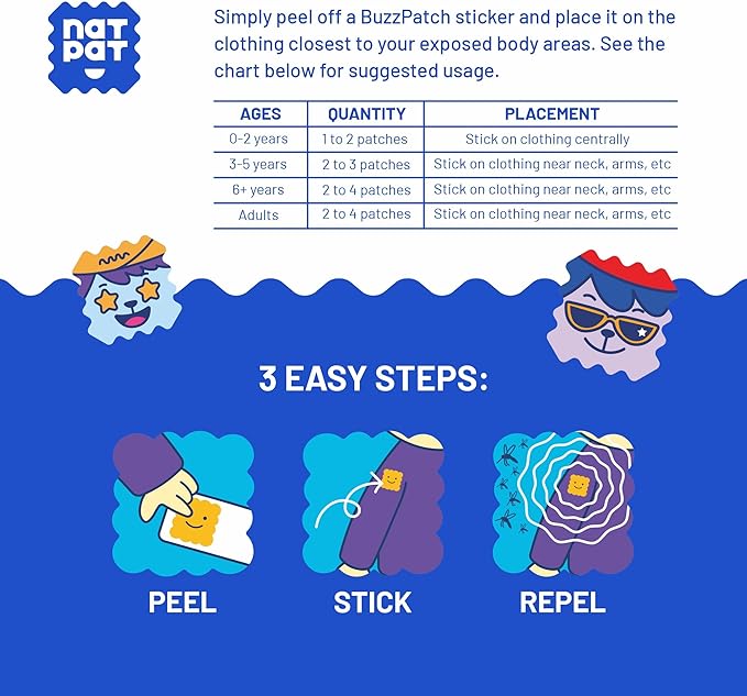 • MEDICAL GRADE ADHESIVE PATCHES – Made from non-woven, medical-grade fabric, NATPAT BuzzPatch Mosquito Patches are durable, water-resistant, and designed to stay in place during all kinds of activities. With a pleasant scent and gentle ingredients, these family-friendly patches offer dependable protection for both kids and adults.