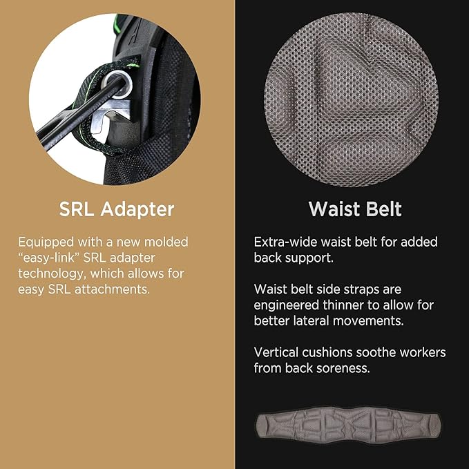 • RELIABLE – Upgraded hi-viz lime braided webbing designed with a high-tension stitching pattern for maximum visibility, security and a tensile strength of over 5,000 lbs! Tough webbing is highly resistant to abrasion, aging, and will not soften from frequent use. Thick sturdy belt for tool bag carrying convenience. Durable lanyard keepers on both straps for easy parking of hooks and carabiners. Equipped with a new molded “easy-link” SRL adapter technology, which allows for easy SRL attachments.
