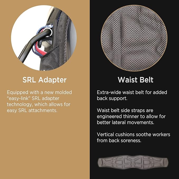 • RELIABLE – Upgraded hi-viz lime braided webbing designed with a high-tension stitching pattern for maximum visibility, security and a tensile strength of over 5,000 lbs! Tough webbing is highly resistant to abrasion, aging, and will not soften from frequent use. Thick sturdy belt for tool bag carrying convenience. Durable lanyard keepers on both straps for easy parking of hooks and carabiners. Equipped with a new molded “easy-link” SRL adapter technology, which allows for easy SRL attachments.