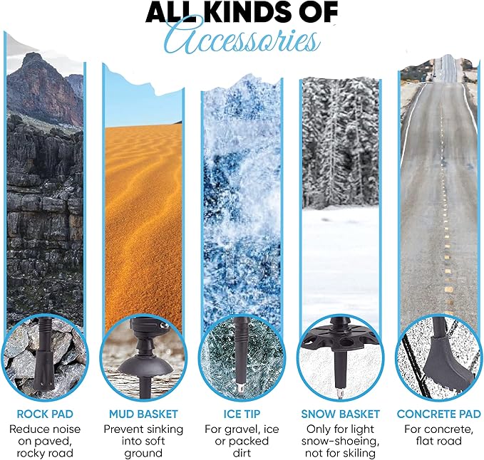 • ✅ All-Terrain Performance: Includes 10 rubber tips for various surfaces—gravel, mud, sand, snow, or pavement. Ideal for trekking, walking, hiking, or mountaineering in all weather.