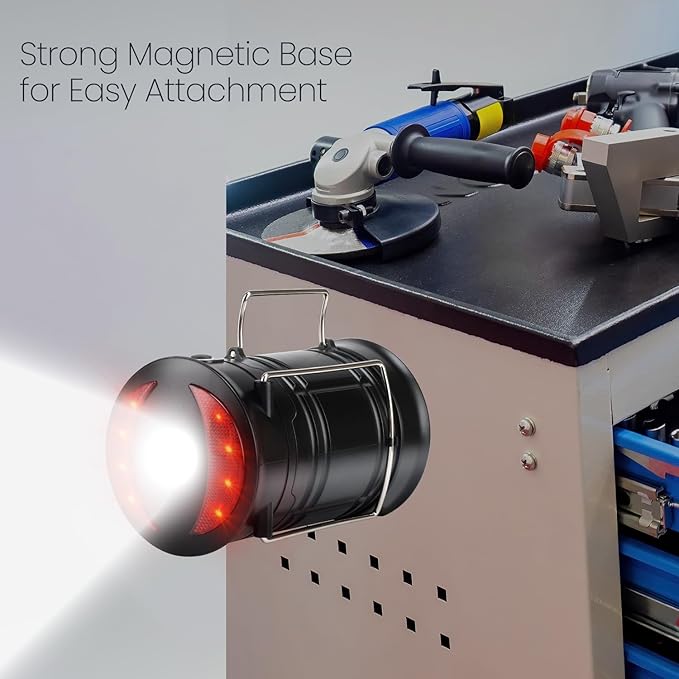 • COMPACT & COLLAPSIBLE: Foldaway handles for suspension, collapses for storage; No switches: pull up handles for brightness control; 2-in-1 flashlight and lantern, hangs easily; 3 strong magnets for hands-free metal attachment