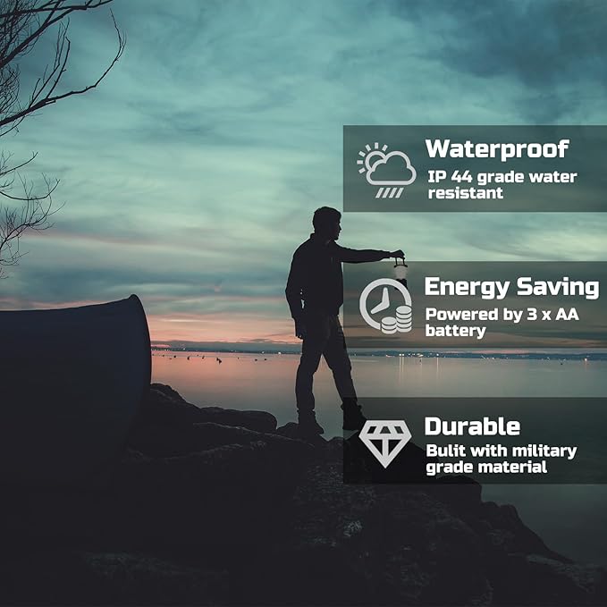 • ULTRA BRIGHT & WIDE AREA: Super bright 200 lumens COB LED for 360° lighting (97 sq.ft coverage); 4 Light modes: 200 Lumens collapsible COB LED lantern, 150 lumens flashlight, red warning light (strobe and SOS); battery not included (3 x AAA needed)