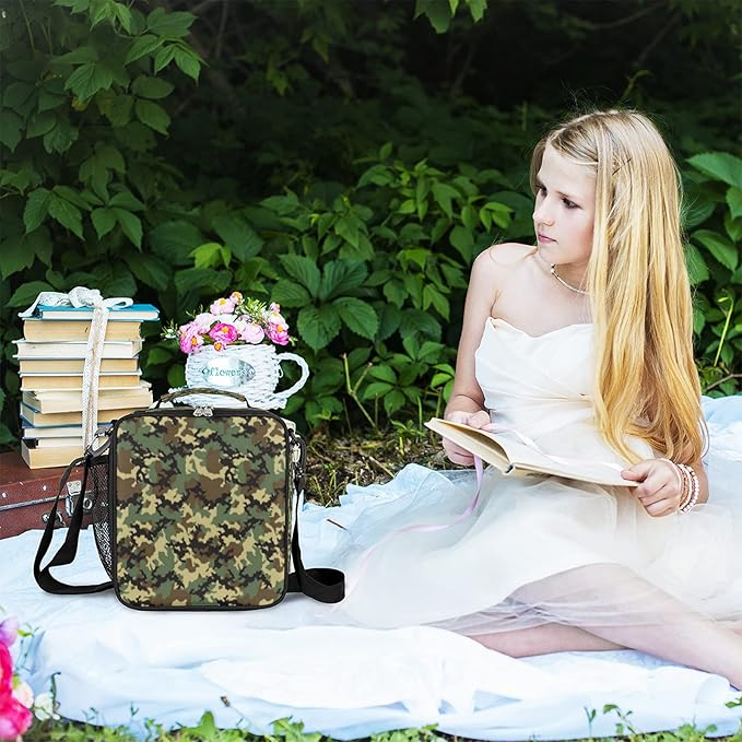 Pardick Camouflage Themed Boys Lunch Bag,Camo Army Green Kids Insulated Lunch Box with Adjustable Shoulder Strap Waterproof Lunch Bento Tote Bag Thermal Lunch Box for School Picnic Travel Outdoor