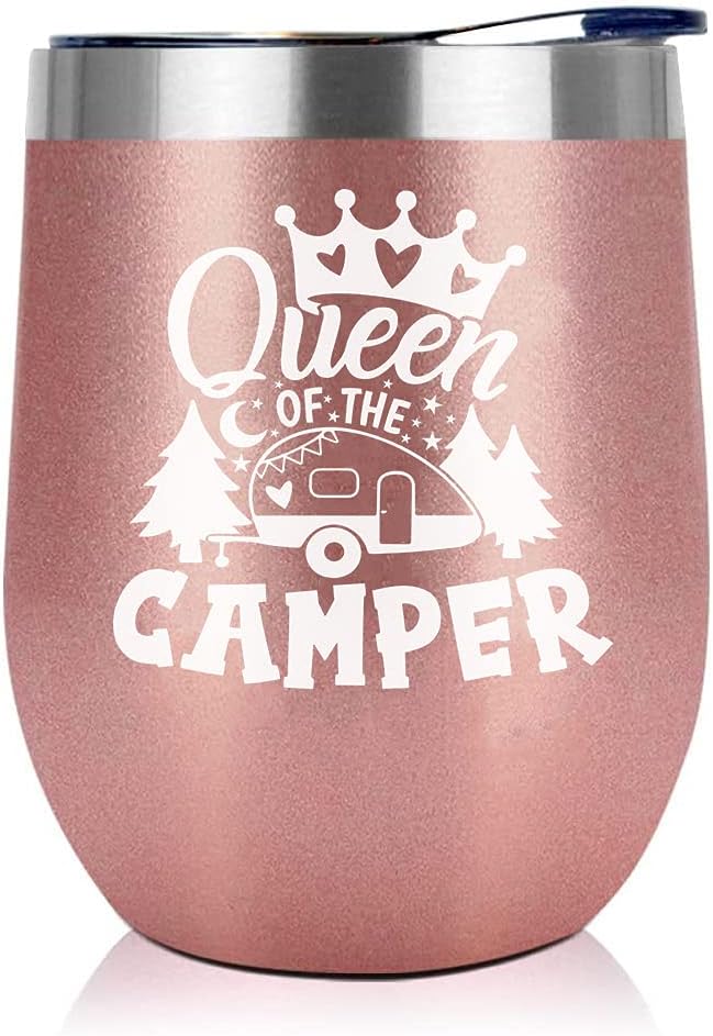 Queen of The Camper Wine Tumbler, Camping Coffee Mug Cup, Women Campers Stemless Tumblers with Lid Stainless Steel Insulated Vacuum 12 Oz, RV Gifts for Camping Lovers Outdoors Hiking