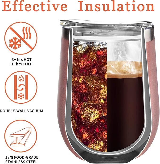 • 👑Design: Double wall vacuum insulation keeps drinks cold for 9+ hours and warm for 3+ hours. And the Stemless Design makes the wine or juice stable in the cup and not easy to spill, slide latch lids to keep spills under control.