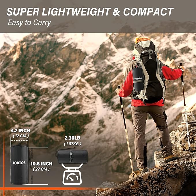 • Extra Thick Camping Pad: TOBTOS sleeping pad is wider and thicker than others on the market. It can be up to 6 in thick once full of air, which is our biggest advantage. It can stay away from the hard ground and sleep comfortably in any sleeping position
