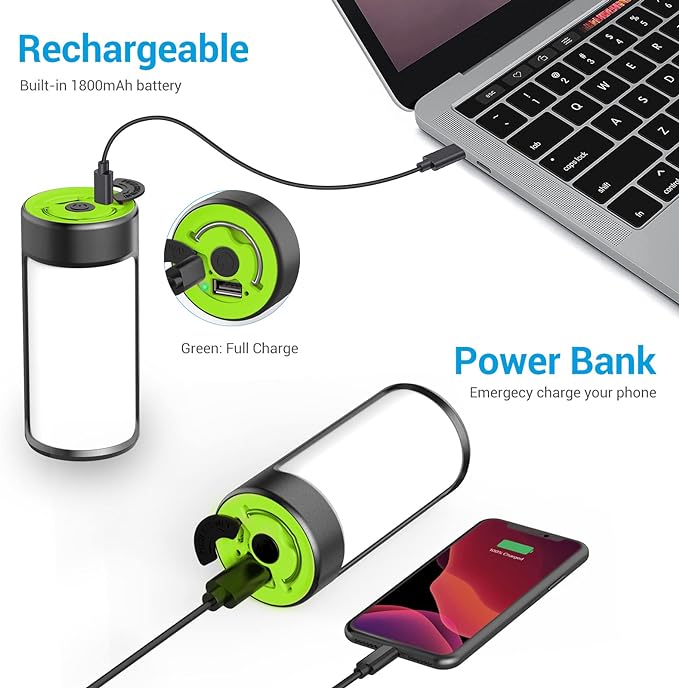 • 【Rechargeable Camping Lanterns】These camping lights for tents are rechargeable, they can be fully recharged via the USB cable for around 2 hours, then one light can last 3-10 hours, more convenient and eco-friendly than other lanterns which need AA batteries. Our camping lantern has also built-in a USB output port and a 1800mAh battery that allows charging a mobile phone in emergency situations.