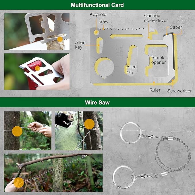 • 【Must Have Survival Gear and Equipment】Our survival kit contains everything you need when there is any emergency situation occurs. 30 popular camping accessories are in the kit: 14 in1 Hatchet, Tactical Pen, LED Headlamp, Bottle Hanging Buckle, 8 in1 Multi-use Spork, Survival Bracelet, Fire Starter, Fire Starting Stick, Climbing Hooks, Multifunctional Card, Wire Saw, Emergency Blanket, Fishing Equipment Kit, Keychain Screwdrivers.