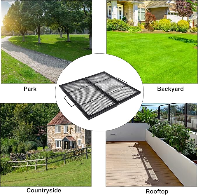 • 【Foldable & Portable】 The cooking grate for fire pit can be folded in half for carrying and storing easily. Folded size: L36 x W15.2 x H1.8inches/90 x 38.5 x 4.5cm. Net weight: 16lbs/7.3kg. You can carry or move it easily with its two solid handles.