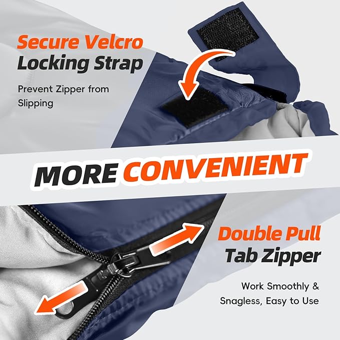 • EXCELLENT DESIGN : The double pull tab zipper on the right side makes it easy for you to open and close from inside or outside, work smoothly & snagless. The zipper at the bottom lets you ventilate the foot section for better temperature control. On warm nights, unzip it and use like a blanket