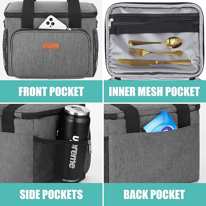 Tiblue Insulated Lunch Bag for Women/Men, Reusable Lunch Box for Office Work School Picnic Beach, Leakproof Freezable Cooler Bag with Adjustable Shoulder Strap for Kids/Adult(Large, Charcoal Grey)