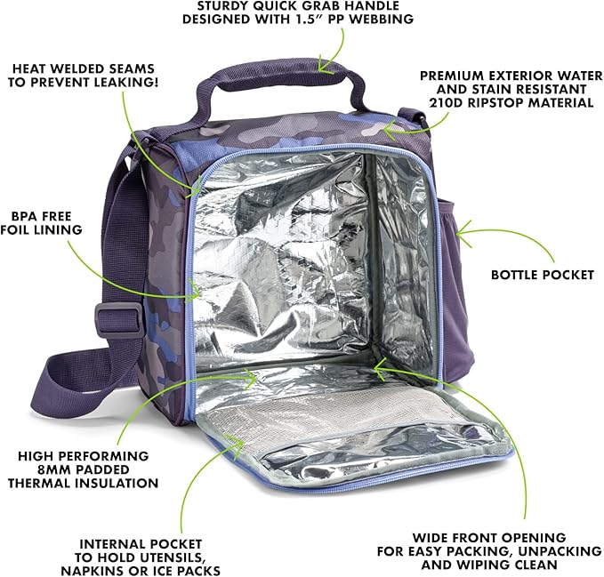 • FEATURES - Wide front opening for easy access to food, internal pocket for utensils or ice packs, 2 exterior stretchy mesh pockets for drinks, a shoulder strap for easy carrying, and thermal insulation to maintain food temperatures.