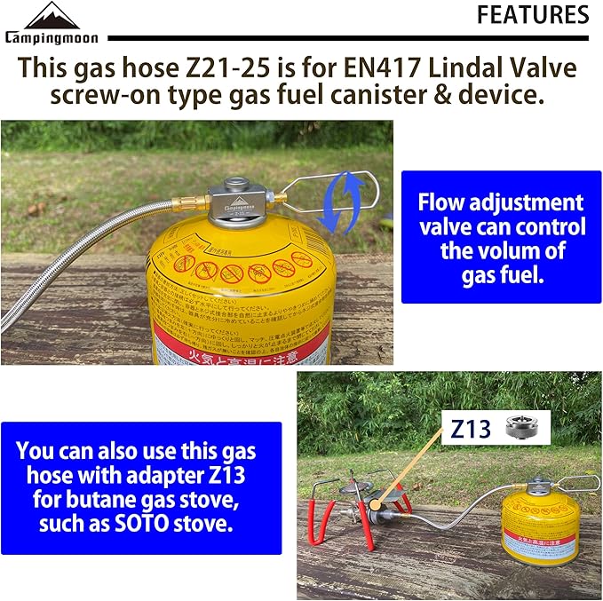 camping moon CAMPINGMOON 9.8-inch Multi-Function Gas Hose for EN417 Lindal Valve Screw-on Type Canister and Device Z21-25