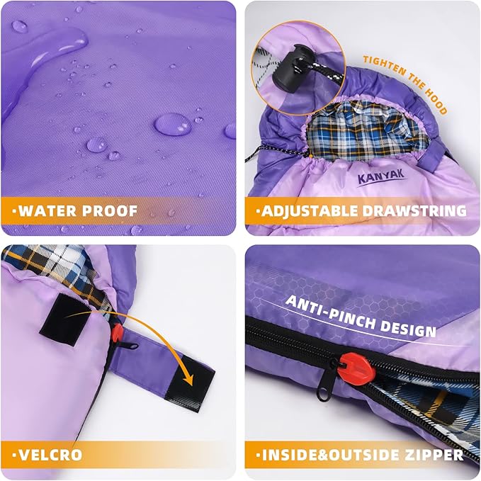 • Sleeping Bag Material : Shell Material - 210T Anti-tearing Polyester Fabric which is waterproof and Breathable for optimal warmth and insulation to protect you from the elements. Lining Material - polyester pongee which is cosy and flexible to make you sleep well with KANYAK sleeping bag.