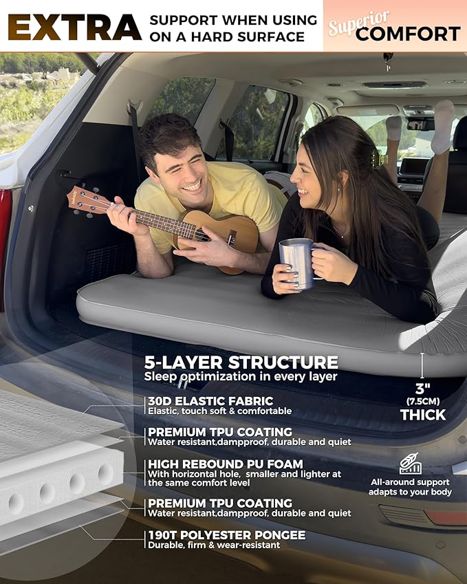• PERFECT FOR TWO PEOPLE: Designed for two people, this Queen-sized double sleeping pad offers ample space for a comfortable night’s sleep. With dimensions of 79.1 x 50.4 x 3.0 inches, it provides plenty of room to stretch out. Whether you’re camping in a tent, truck, or under the stars, you can enjoy the luxury of extra space and comfort with your partner.