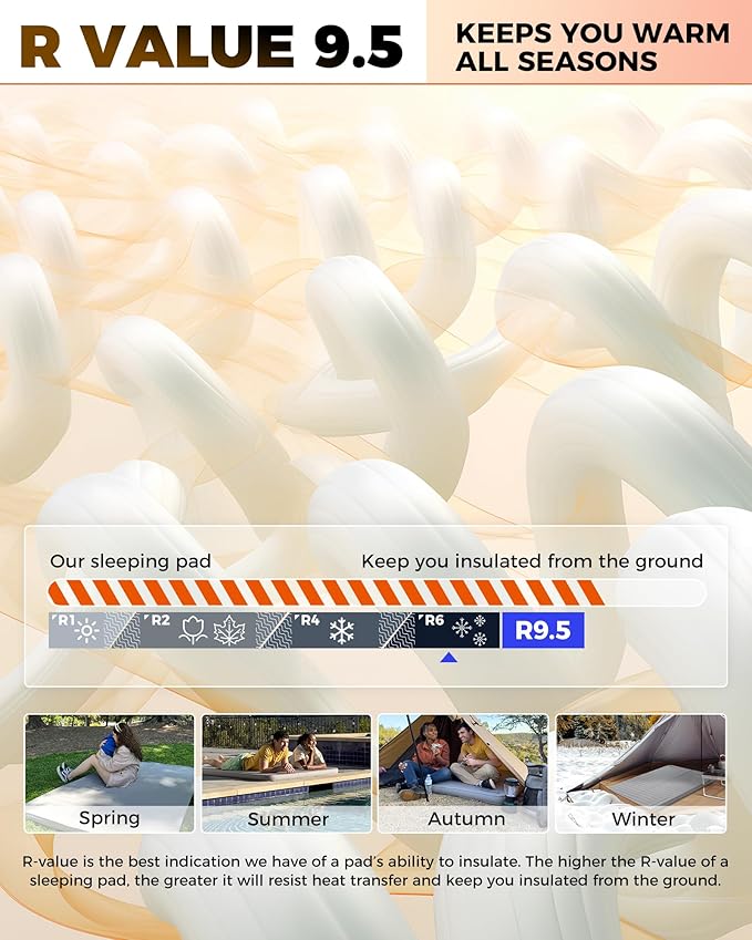 • HIGH R-VALUE 7.9 FOR EXCELLENT INSULATION: The KingCamp double sleeping pad has a high R-value of 7.9, providing superior insulation to keep you warm and comfortable, even in colder conditions. It effectively blocks the cold from the ground, ensuring you stay cozy through chilly nights during camping, hiking, or backpacking.