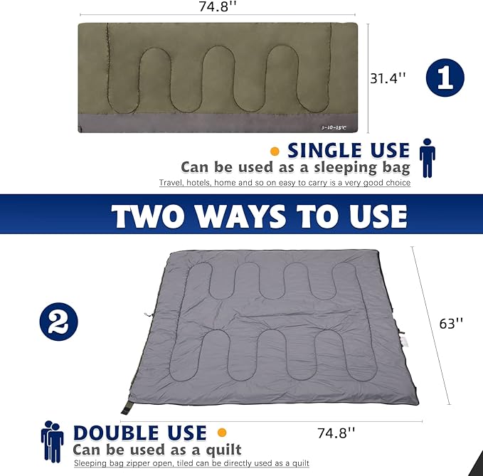 • [Spacious Design] the sleeping bag can accommodate an adult and still has spacious space to bring you a comfortable experience.