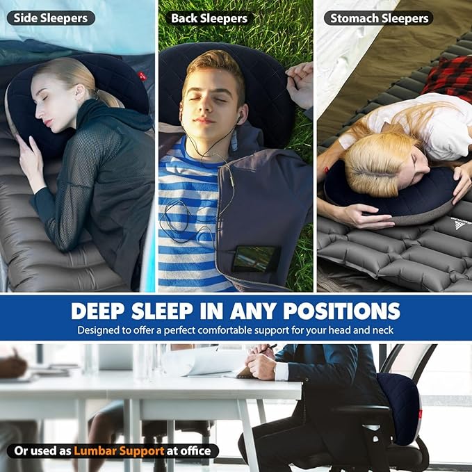 • π’π€π˜ π†πŽπŽπƒππ˜π„ π“πŽ πŽπ”π“πƒπŽπŽπ‘ 𝐒𝐋𝐄𝐄𝐏𝐋𝐄𝐒𝐒 ππˆπ†π‡π“π’: Looking for a camping pillow which not only can provide a perfect comfortable support for your neck and head, but also so light and compact to carry on the go? Well, here is your new inflatable pillow. Designed with a soft, breathable cover and ergonomic construction, our backpacking pillow will provide maximum comfort and let you have a restful sleep under stars!