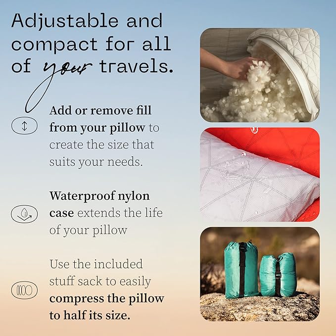 • Adjust It and Enjoy Restful Sleep: Our backpacking pillow is compressible and adaptable to any environment. Add or remove foam to select the right fill for you. You'll enjoy restful sleep, no matter if you're in a hotel or hiking.