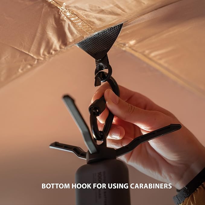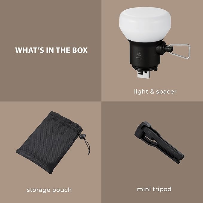 • MINI TRIPOD WITH HOOK - The Lamp also comes with a mini tripod that can be used as a stand and has a loop attached to the bottom for connecting carabiners for mounting to various items such as tents, trees, backpacks, and more.