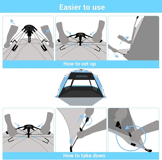 • 【Fully automatic Pop Up Beach Tent】All you need to do is lift the top pole with the force of a bottle of water, and the fully automatic stand system does the rest. New tent pole construction with bucket ty-wrap and patent carry bag help you spend less time folding back. The Pop Up Sun Shelter utilizes the traction automatic lift technology to enhance the elastic compression retractable, one person can easily open it in one second, close it in two seconds, and tidy it up in three minutes