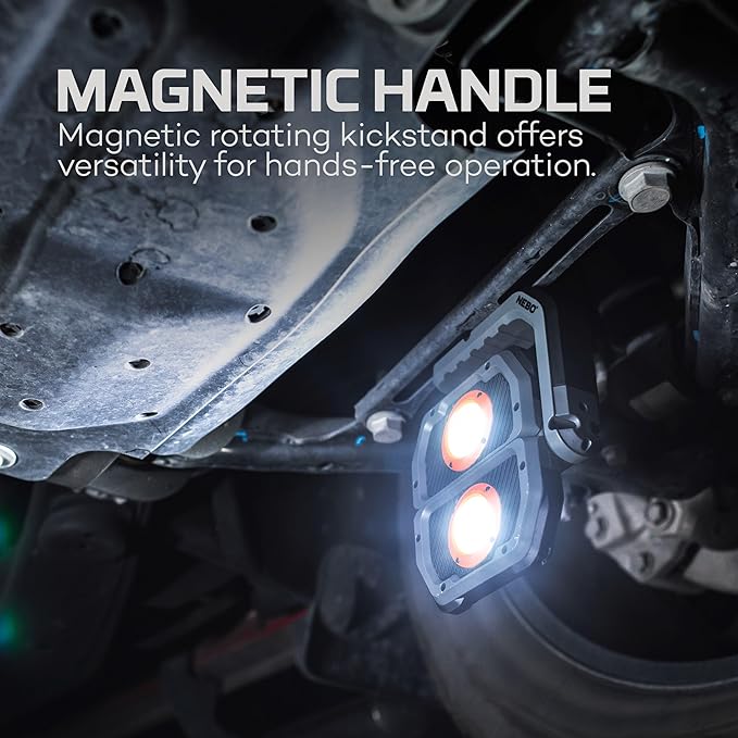 • COMPACT & CAPABLE: This LED shop light is impact resistant for easy carry in a tool bag, and water resistant for damp crawlspace. The magnetic handles and COB panels rotate, enabling you to line up this magnetic work light for optimal visibility.