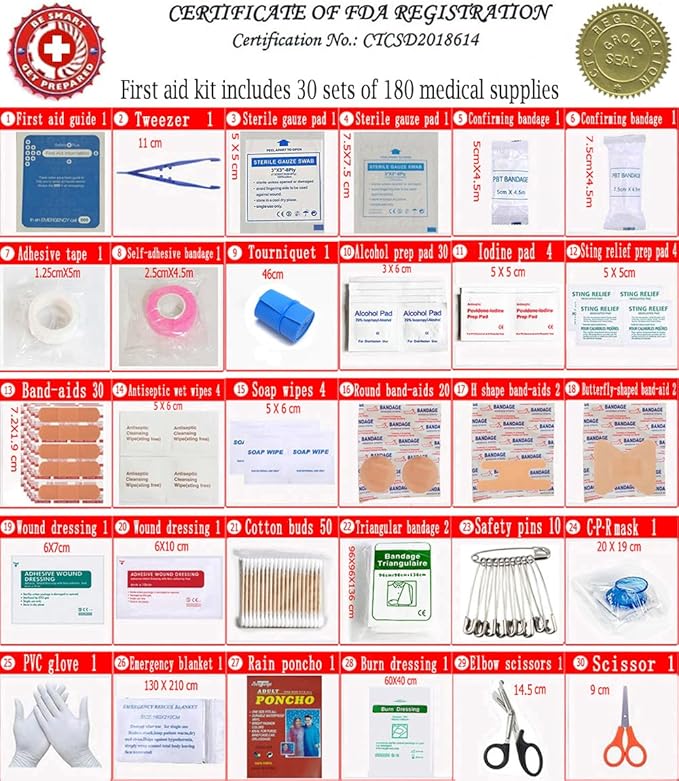 • ✅: Our first aid kit includes 30 sets of 180 pieces of medical supplies. With 8'' x 6'' x 4'' overall dimension the kit weights only 1 lb. Water resistant nylon case and it protect your medical supplies. It's light, and is all organized nicely. The kit also offer extra space to add your own stuff.