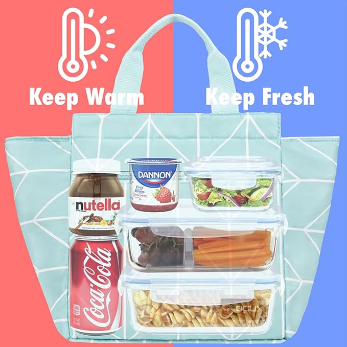• INSULATED WOMENS LUNCH BOX BAG: Measures 10" x 7" x 10" (L x W x H). Capacity fits up to 12 soda cans. Lunch box for women, girls, men, kids, and adults is ideal for ladies to bring lunch, snacks, fruit, and ice packs to work, school, and office. Thermal insulated lunch tote is reusable, and soft with padded insulation to keep food containers and drinks fresh, cold, or warm.