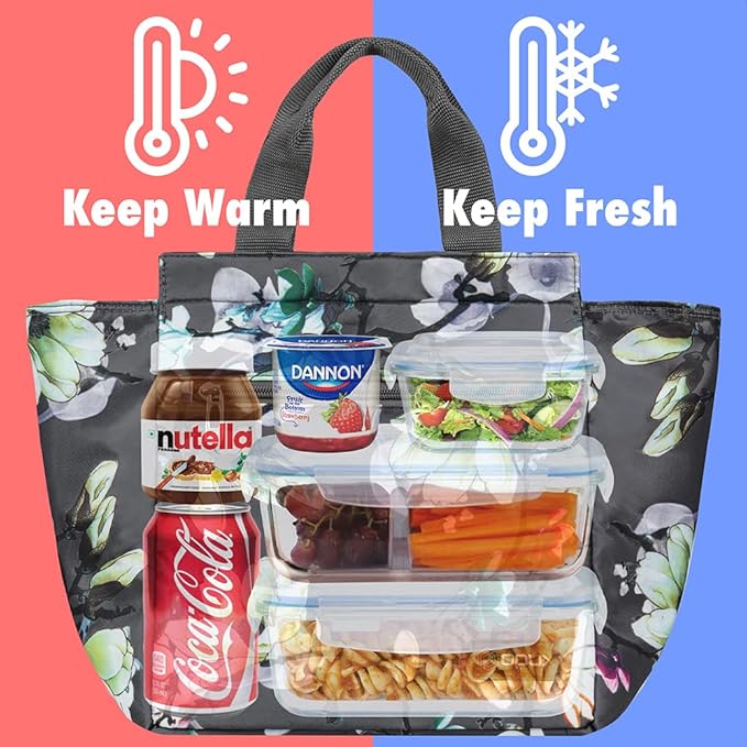 • INSULATED WOMENS LUNCH BOX BAG: Measures 10" x 7" x 10" (L x W x H). Capacity fits up to 12 soda cans. Lunch box for women, girls, men, kids, and adults is ideal for ladies to bring lunch, snacks, fruit, and ice packs to work, school, and office. Thermal insulated lunch tote is reusable, and soft with padded insulation to keep food containers and drinks fresh, cold, or warm.