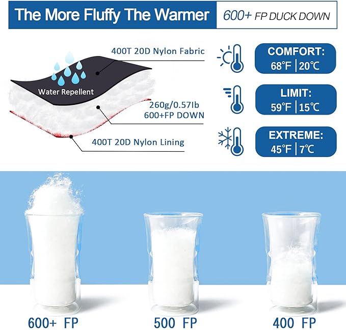 • 【 πŠπ„π„π π–π€π‘πŒ 】The camping sleeping bag is filled with 9.2oz selected duck down with 600 Fill Power, suitable for warm weather. Pure natural and healthy material, fluffy and soft, no odor or impurities. The sleeping bag specially adds a 1.6 " cloth strips for wind protection. Comfortable Temperature:59Β°F-68Β°F, Limited Temperature: 45Β°F, your great choice for summer sleeping bag!