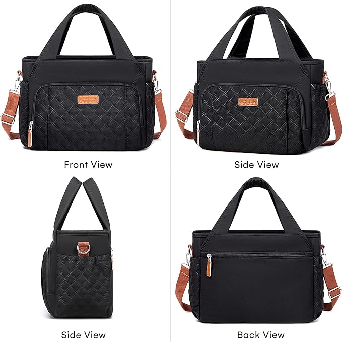 • Fashion Women Lunch Bag - Large lunch bag dimensions (11.7" H X 9" L X 6.5" W) with a main spacious space to store and keep fresh all your daily essentials. Two side pockets are perfect for storing your bottles and umbrella. Two front zippered pockets and two back pockets are perfect for storing your tissues, IPAD, snacks, cell phones, keys, cards, knives and forks, etc.