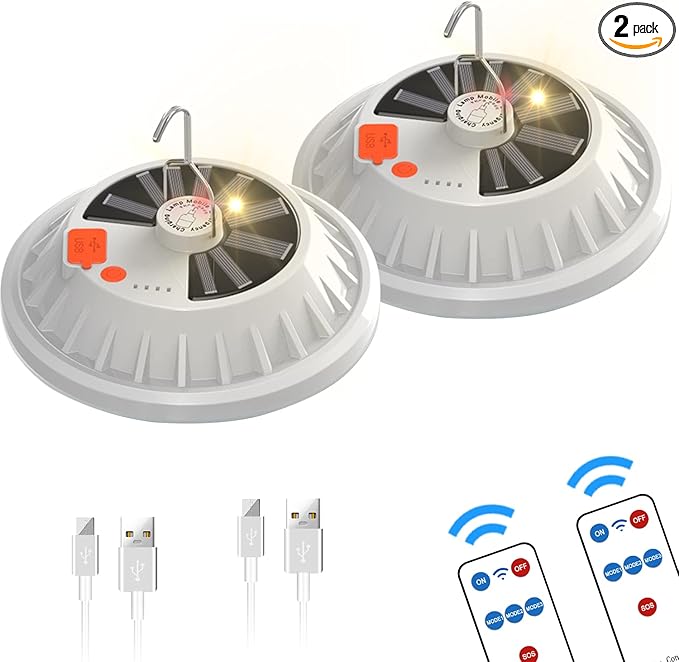 Solar Camping Lantern, BaishenglinMotor LED Solar USB Rechargeable Portable LED Lanterns Flashlights with Remote Control for Indoor Outdoor Home Emergency Power Outage Hurricane Supplies 2-Pack