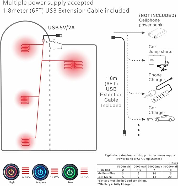 • ❤【5PCS ELECTRONIC HEATING PADS】5PCS Heating Pads 3D system will be compatible with any 5V/2A USB power supplies from cellphone Charger, Cellphone Power bank , Car jump starter, Car phone charger, and others. 5 heating pads are able to warm the shoulder, Chest, hip and feet areas.