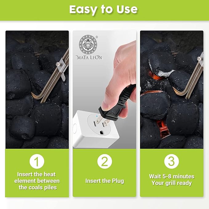• Easy to Use : Just put charcoals to cover the heat coils elements part , and plug in the socket. Wait 6-10 mintues. Your grilling will ready to use. No extra jobs. Never worry coals will dim or blowed out